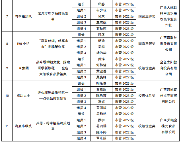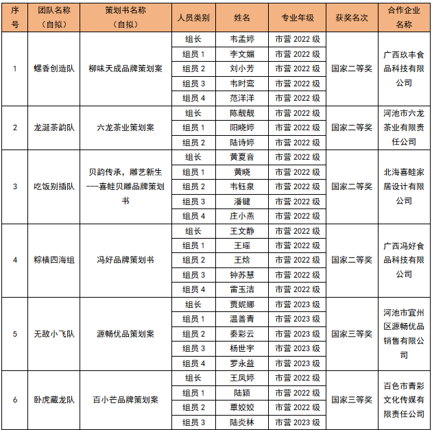 2025年全国高校商业精英挑战赛品牌策划竞赛全国总决赛暨(新加坡)全球品牌策划大赛中国地区选拔赛于近日圆满落幕。在市场营销教研室主任刘蕙荟及专任教师莫凯、梁海东、黄瑞吉、李冬哲、邓建秋、陆涛的悉心指导下,市场营销系选派的“无敌小飞队”、“卧虎藏龙队”、“龙延茶韵队”、“与李相约队”、“吃饭别插队”、“螺香创造队”、“棕横四海队”、“TWO小组”等11支参赛队伍,斩获国家级二等奖4项、国家级三等奖4项,校级优胜奖3项。(具体获奖名单详见附表)