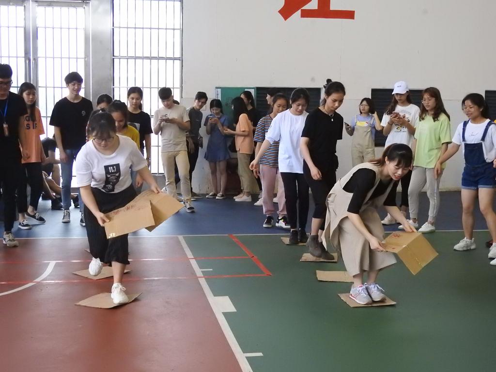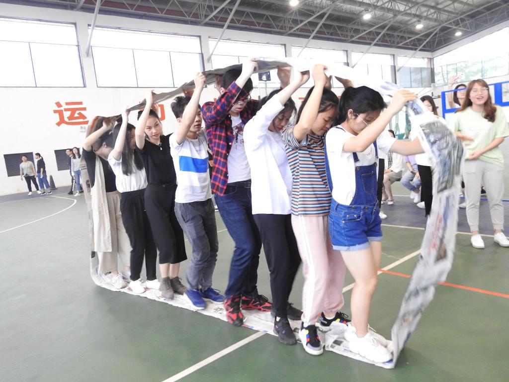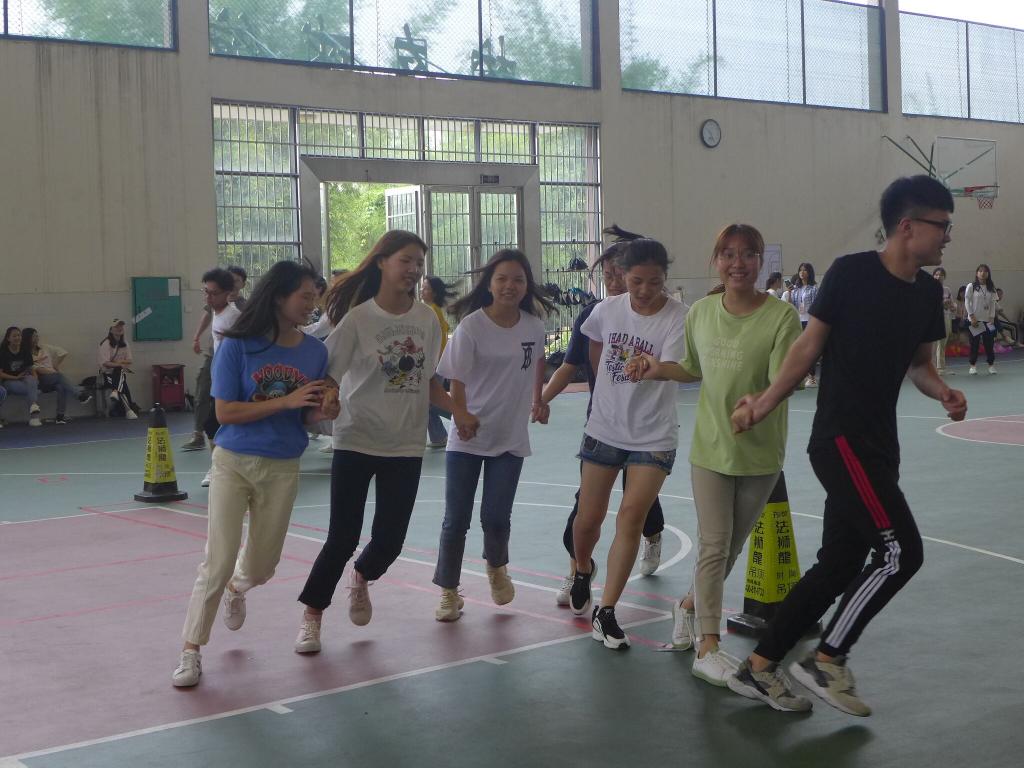 本次心理趣味运动会采取积分赛制,参赛选手分成四队分别创建自己的团队队名、口号并现场展示后共同参与了踩报纸前进、拍七令、搭桥过河、传纸圈、8人9足、拔河等六个项目。比赛设计趣味十足,需要团队成员共同协作才能完成,考验的是互帮互助、默契配合的团队精神。趣味运动会既有热烈的竞赛又不失轻松愉悦的气氛,参赛团队自信满满地全力以赴完成每个项目,围观的同学不时发出欢呼声和掌声,除了正式比赛的六个项目,现场的拉拉队和工作人员也穿插参与了“大手拉小手”、“传纸圈”和拔河比赛并获得棒棒糖奖励。整个赛场内洋溢着青春的热情、友谊的温馨氛围。