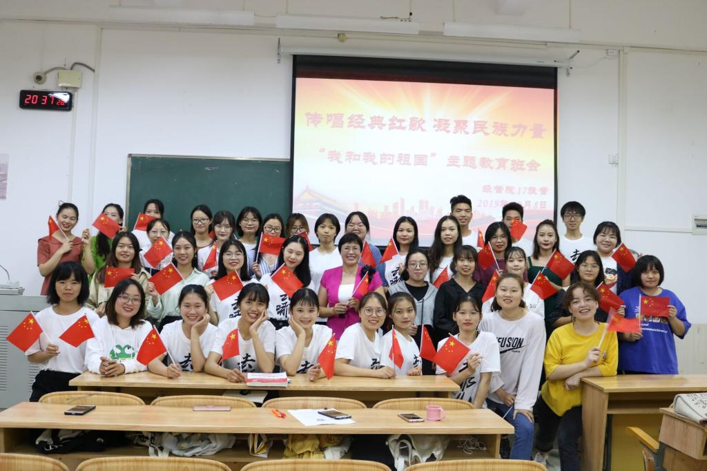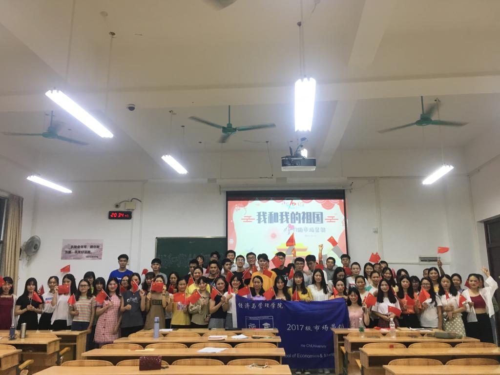 本次活动中各班以“我和我的祖国”为主题,遵循“知-情-意-行”的教育规律,纷纷组织以“学起来”“唱起来”“讲起来”“做起来”为主要内容的教育活动。其中,“学起来”以课堂教学、主题班会等形式,深入学习习近平新时代中国特色社会主义思想,深入学习党史国史、改革开放史、社会主义发展史,不断增强师生“四个自信”。17、18级大多数班级通过PPT演示,观看纪录片《我和我的祖国》片段等等进行爱国主义教育;“唱起来”以歌咏活动、文艺演出等形式唱响主旋律、讴歌新时代,展现bwin必赢官网师生的良好精神风貌。17旅管班的"传唱经典红歌,凝聚民族力量"主题班会,以宿舍为单位逐一向全班介绍一首红歌并深情演唱,增强活动的时代感、吸引力、感染力;“讲起来”组织师生讲述“我与祖国共成长”的励志奋进故事,分享成长体会,展现家国情怀。17市营等班级组织学生谈自己的爱国感想进行爱国知识竞赛。19级新生班由班主任带头分享受国故事,弘扬爱国情怀;“做起来”以社会实践、志愿服务、参与国庆活动等形式,以实际行动表达爱国热情。