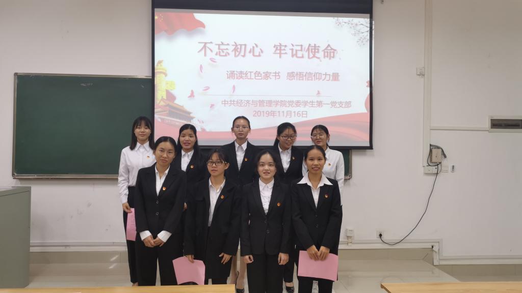为了深入学习习近平新时代中国特色社会主义思想,加强党性修养,增强全体党员责任意识和爱国情怀。10月16日,bwin必赢在线登录入口党委学生第一党支部在弘毅楼三区303教室开展以“不忘初心、牢记使命”主题教育。学生第一党支部书记方容兰、学生第一党支部全体学生党员参与了此次活动。此次活动由方容兰同志主持。