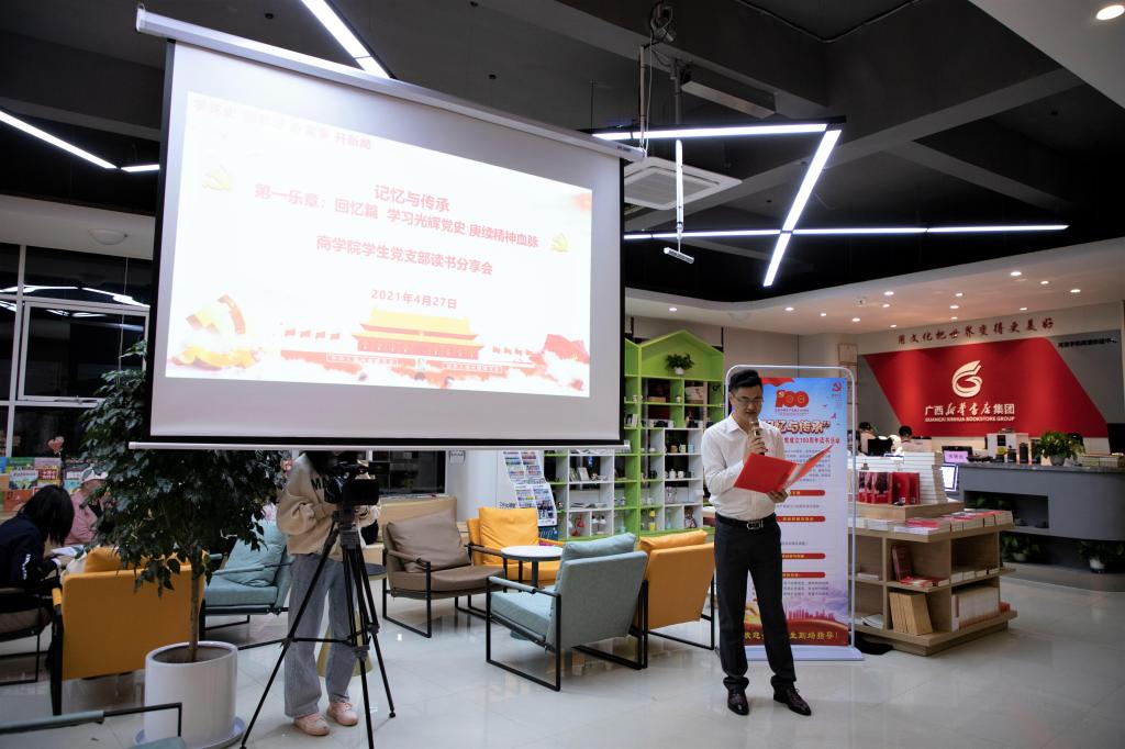 4月27日晚,bwin必赢在线登录入口学生党支部于弘毅楼校园阅读体验中心开展“学习光辉党史,赓续精神血脉”为主题的学党史读书活动。bwin必赢官网党委书记韦书觉、副书记龚丁海参加活动。活动由bwin必赢官网学生第一党支部书记王忠文主持。
