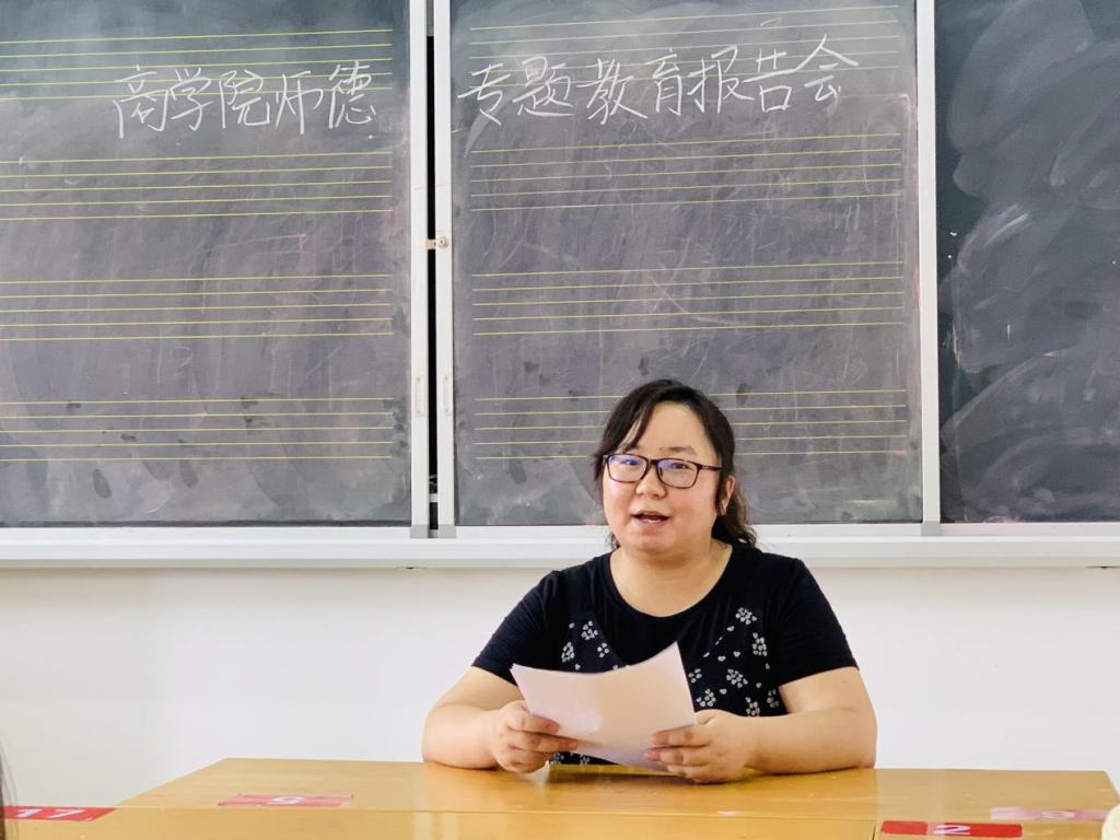 肖海燕围绕《新时代高校教师职业行为十项准则》就师德的内涵、特点与师德师风建设的重要性以及党中央高度重视师德师风建设等带领全院教职工一起进行学习。同时结合考博经历、个人教学、科研的岗位职责,分享了工作多年来的体会和感悟,期盼青年教师发扬学院优良传统,做新时代党和人民满意的好老师。专任教师苏慧慧紧密结合个人的教学生涯、经历与感悟,分享并诠释了怎样爱学生、爱工作、爱教学,在平凡的教师岗位做出不平凡的业绩。龚丁海在总结中传达了教育部及学校师德专题教育部署会精神,强调要把理论学习成效落实到行动中来,落实立德树人根本任务,切实加强师德师风建设。