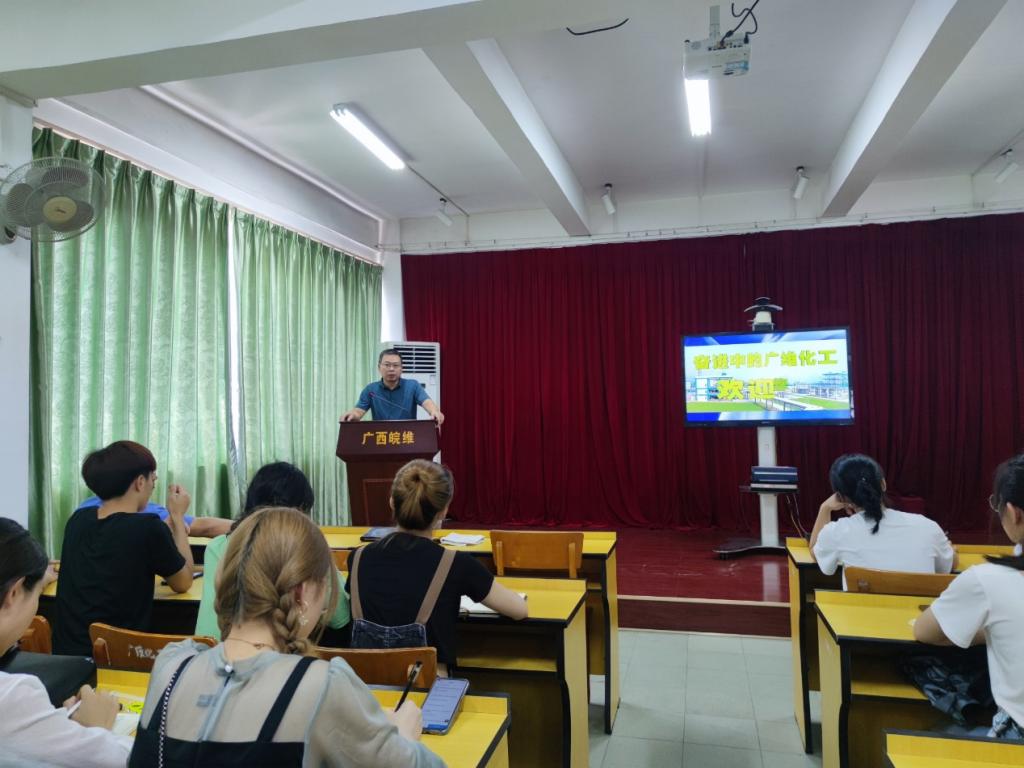 广西皖维工会主席韦茂双对到来的师生表示欢迎,对公司发展历程、现有职工情况、人才成长通道和部门组成情况进行了详细的介绍。同学们观看公司宣传视频并进行现场交流学习。莫凯在活动中鼓励学生继续“以知促行”,在每一次的见习中都更一步精进业务,提高综合素质。