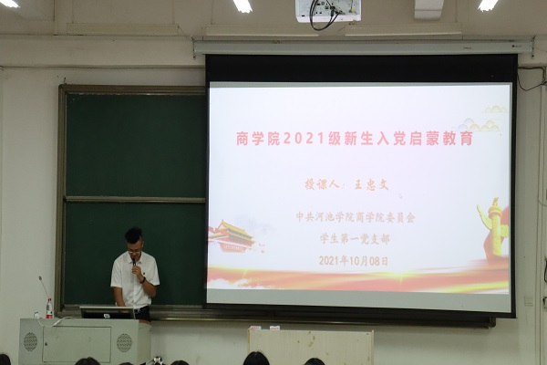 王忠文重点围绕习近平新时代中国特色社会主义思想和中国共产党百年历史,结合新形势下发展党员的工作要求,从党的基本知识、党员标准、入党程序等方面为新生做了详细介绍。同时,希望同学们能够不断提升自身修养,加强对党的理解,端正入党动机,积极向党组织靠拢,增强自身本领才干,为实现中华民族伟大复兴奉献自己的青春力量。