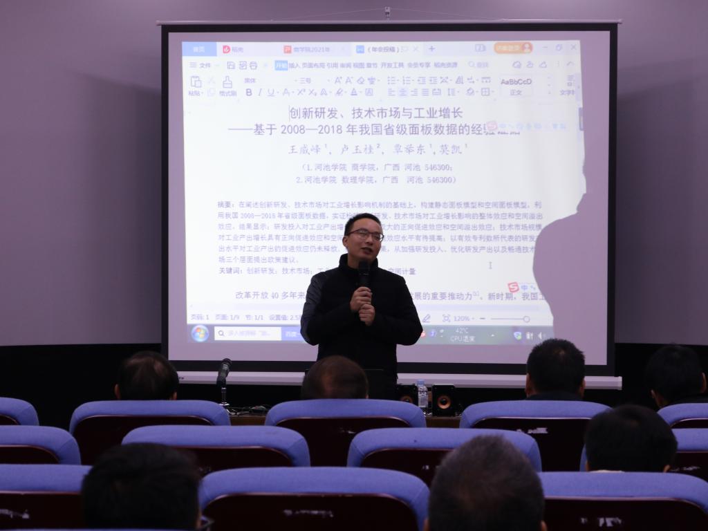 为深入贯彻新发展理念,服务构建新发展格局,全面塑造发展新优势,努力做好科研工作,12月29日晚,bwin必赢在线登录入口于弘毅楼3-504举办2021年第一届以“推动经济社会高质量发展”为主题的学术年会。学院党委书记韦书觉、院长覃举东、副院长韦福巍、肖海燕、全校征集的论文作者以及bwin必赢在线登录入口全体教师出席本次会议。会议由韦福巍主持。