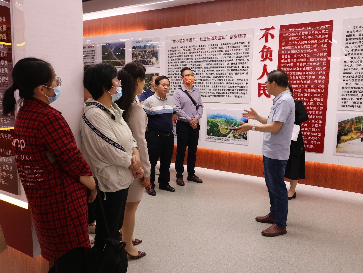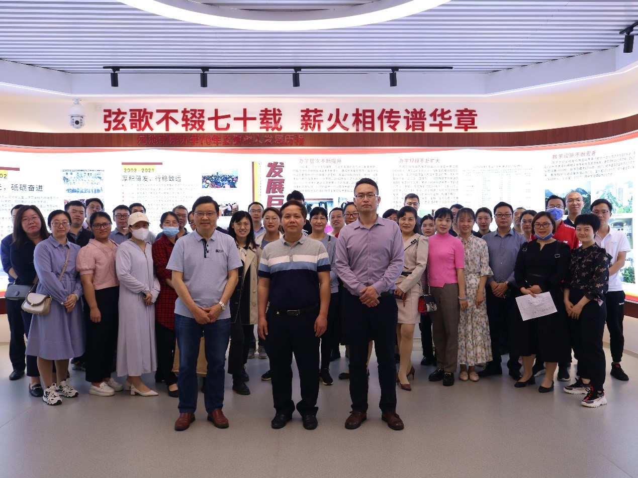 校史馆内设三馆,分别是校友馆、韦拔群精神馆和脱贫馆。“三馆”合一,相互连接、相互补充,通过展板、录影、实物等方面展示学校办学历程及取得的累累硕果,展示学校扎根河池这片红色土地传承前辈革命精神,在和平年代,谱写属于我们这一代的新篇章。在参观过程中,全体教职工通过第一厅“弦歌不断七十载薪火相传谱华章”,学习我校办学70年来办学历程的历史变革和发展,通过参观第二厅重温我校校训:修德、弘毅、勤业、致远的教育理念和初心。在第三厅教职工们通过学习办学70周年以来的优秀老师和优秀校友代表优秀事迹,重温教书育人,立德树人的初心。