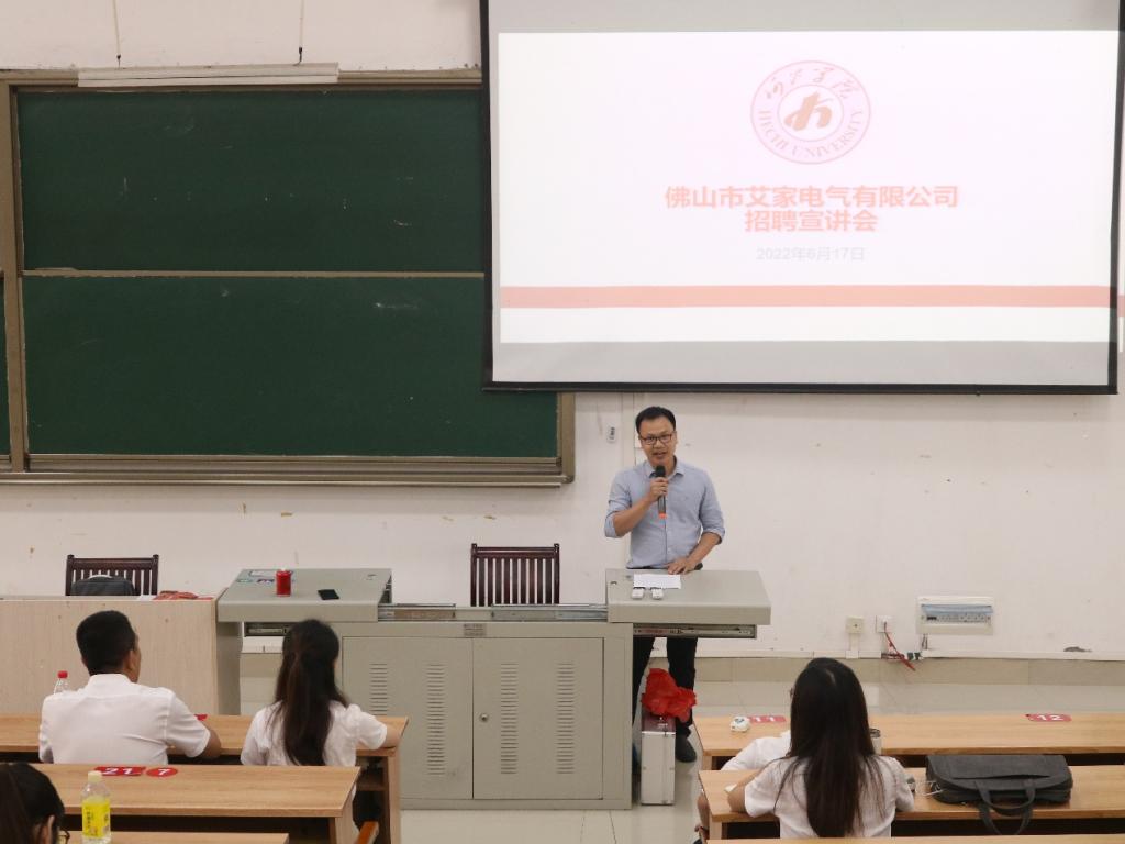6月17日至18日,bwin必赢在线登录入口特邀佛山市艾家电气有限公司相关负责人到bwin必赢官网开展宣讲会、面试等一系列企业进校园活动。bwin必赢官网党委副书记蓝振榕、辅导员黄挺龙及全体18级毕业生参加了此项活动。