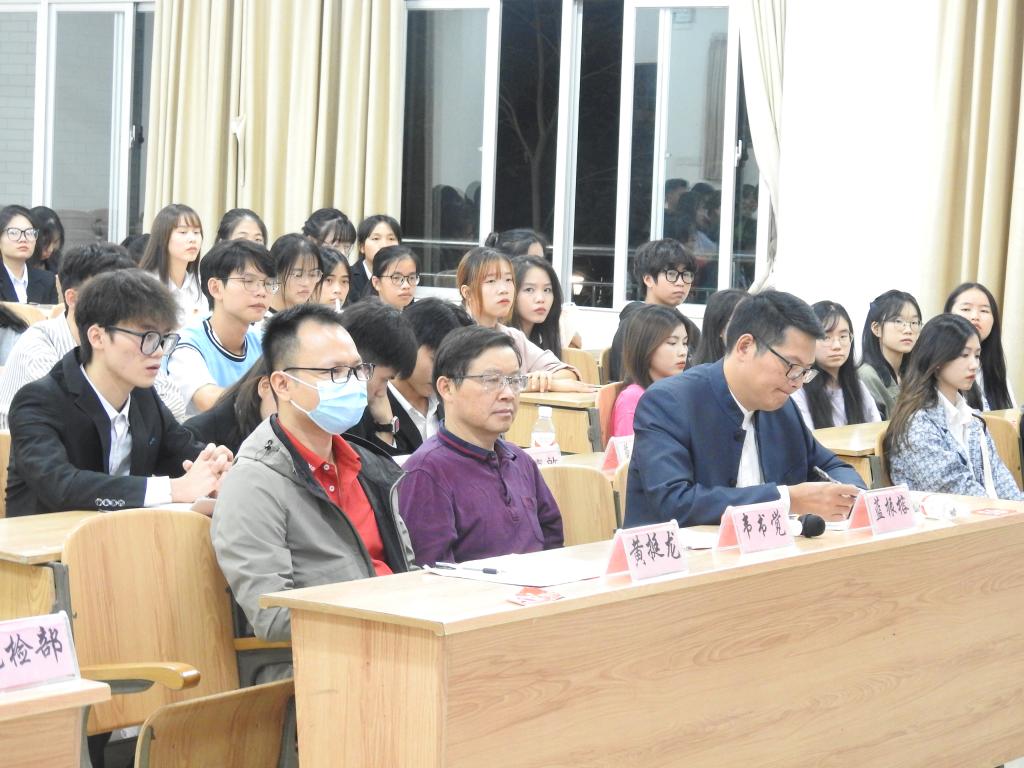 各部门负责人上台介绍部门工作,实习干事上台自我介绍及才艺展示,韦书觉在大会中充分肯定了同学们为准备本次会议的付出,并希望同学们仰望星空树立目标理想,脚踏实地立足现实。在团委、学生会的工作中锻炼自己由想到做的思维模式,并和职业生涯规划结合在一起,在工作中成就自己。蓝振榕表示期望同学们工作学习两不误,善于利用时间,合理安排工作和学习之间的关系。黄挺龙表示期望每位同学都可以茁壮成长,全方位发展。