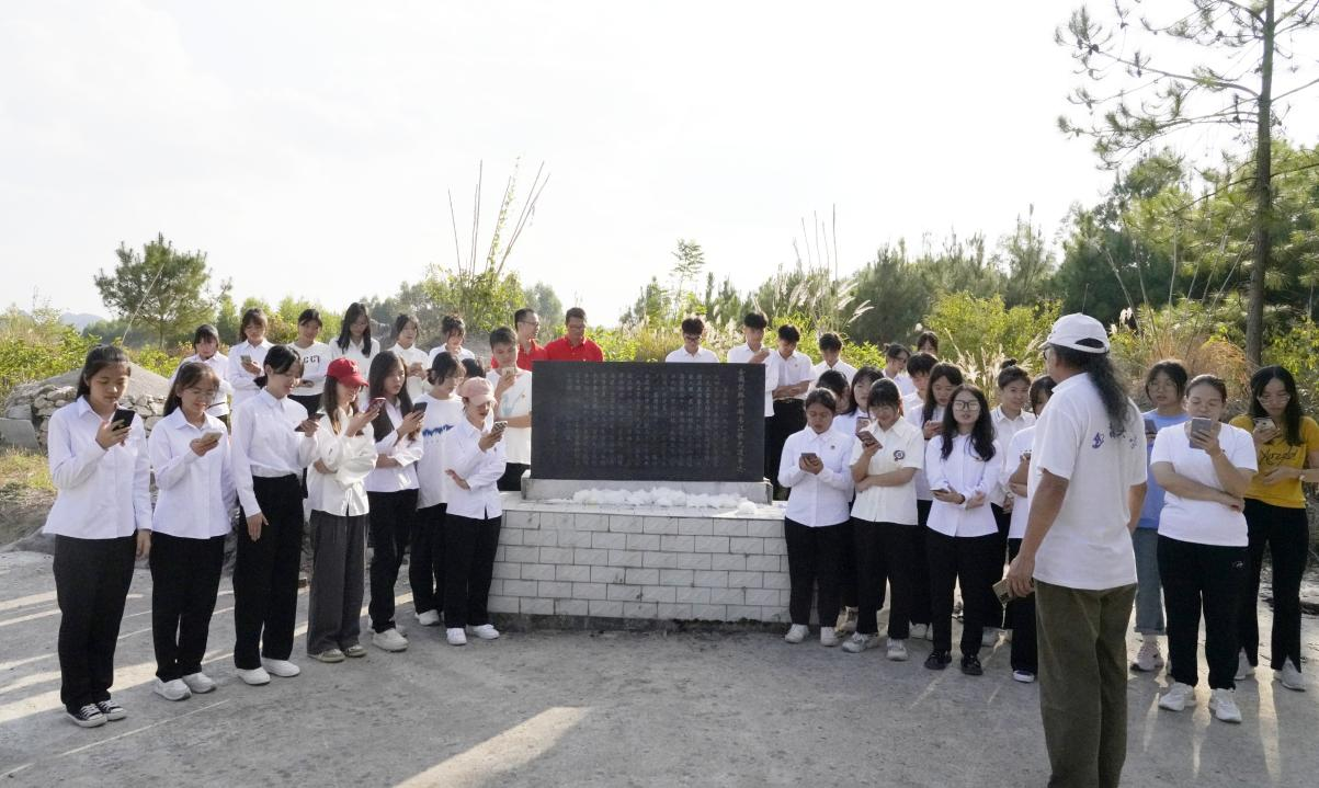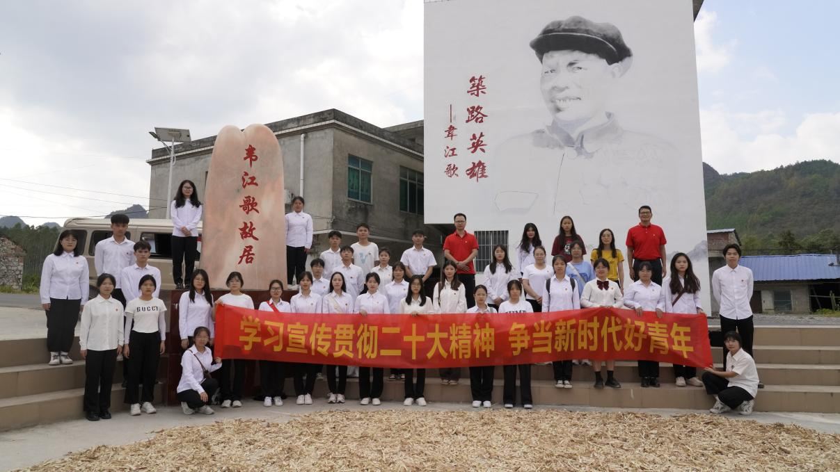 在“筑路先锋”韦江歌故里——北角村北角屯,师生们通过瞻仰韦江歌陵墓、敬献白花、走访韦江歌故居、集体传唱《歌唱二郎山》、重温入党、入团誓词等方式接受思想洗礼、传承红色基因。在韦江歌陵墓前,刘增宪向学生讲述了韦江歌英雄事迹,并让大家学习韦江歌胸怀革命大目标,永做劈山开路人的崇高理想信念;有功不自恃,栽树不乘凉的无私奉献精神;一不怕苦,二不怕死的英勇斗争精神;脚踏实地,艰苦奋斗的“老黄牛”精神。