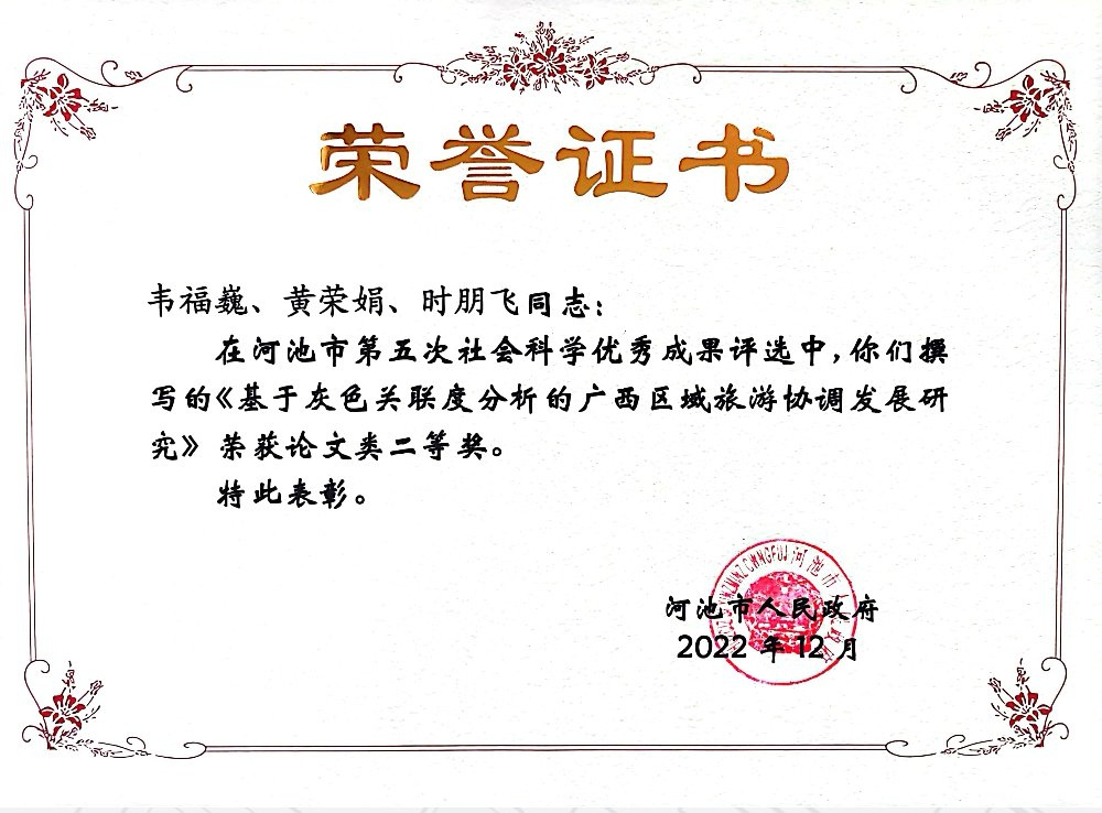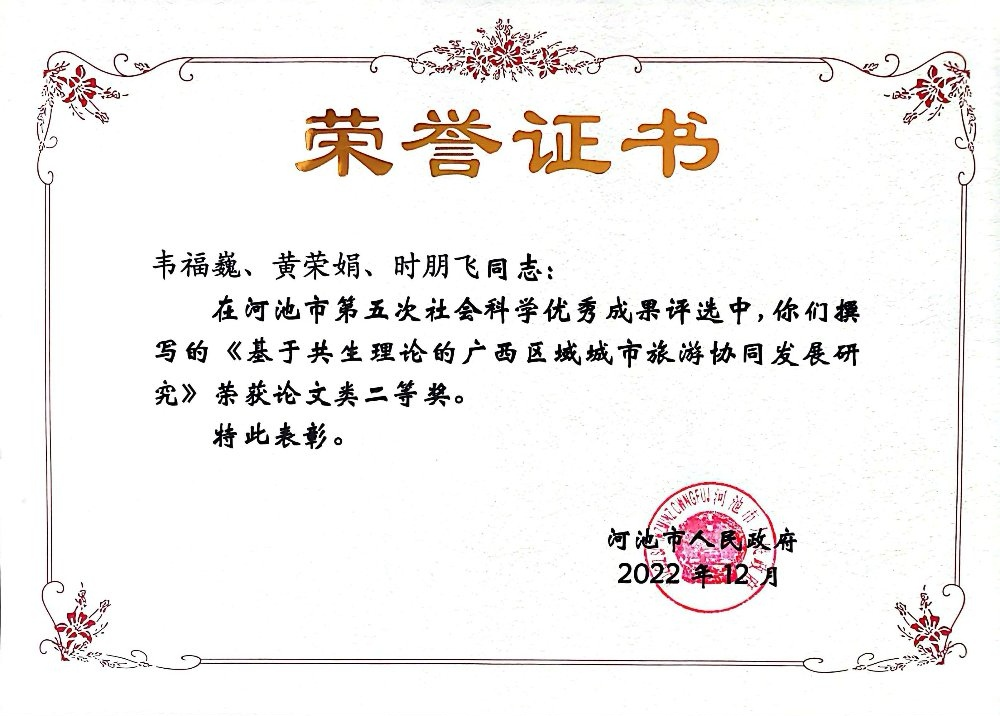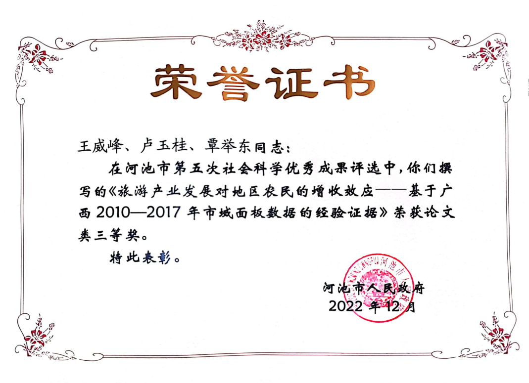 据河池市人民政府关于奖励河池市第五次社会科学优秀成果的决定(河政发〔2022〕26号)获悉,bwin必赢官网申报的四项科研成果全部获奖,其中《基于共生理论的广西区域城市旅游协同发展研究》和《基于灰色关联度分析的广西区域旅游协调发展研究》荣获论文类二等奖、《河池市工业振兴实现途径研究》荣获研究报告类二等奖、《旅游产业发展对地区农民的增收效应—基于广西2010—2017年市域面板数据的经验证据》荣获论文类三等奖。