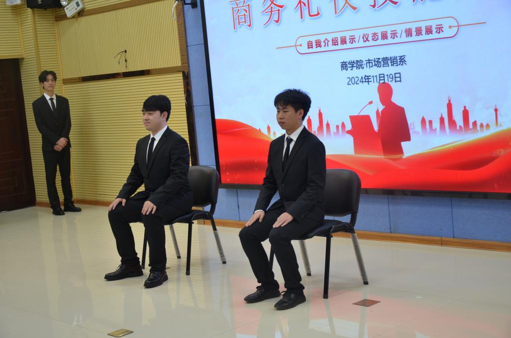 大赛依托《商务谈判与礼仪》课程,分为三个环节:自我介绍环节、礼仪展示环节和情景展示环节。自我介绍环节中,选手们以简洁明了、幽默风趣、诚恳的语言展示个人风采;礼仪展示环节,选手们通过仪容仪表,站姿、坐姿、行姿和蹲姿的展示,凸显商务人员的专业形象;情景展示环节,各团队模拟商务场景,涉及问候礼仪、介绍礼仪、握手礼仪、交换名片礼仪和签订合同礼仪等。比赛现场气氛紧张而活跃,专业而不失趣味,最后,刘蕙荟对本次大赛进行了点评。