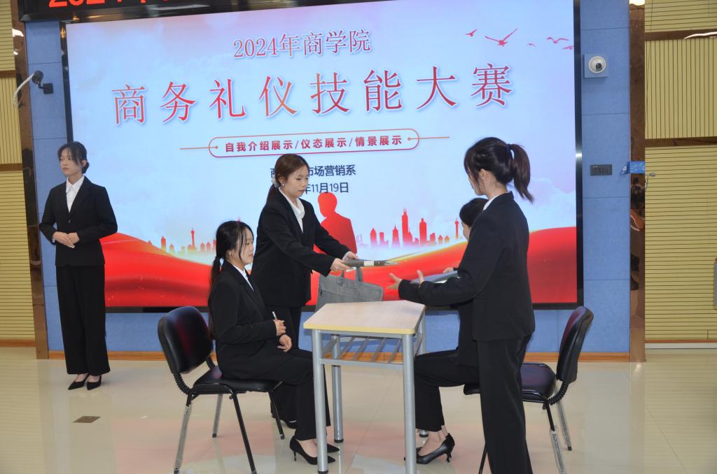 11月19日,2024年bwin必赢在线登录入口商务礼仪技能大赛在图书馆123未来教室成功举行。本次大赛由市场营销系主任刘蕙荟,市场营销系专业教师梁海东、陆涛担任评委,2023级市场营销专业学生贾妮娜主持,共有7支参赛队伍,大赛设一等奖一名,二等奖一名,三等奖一名,优秀奖一名。