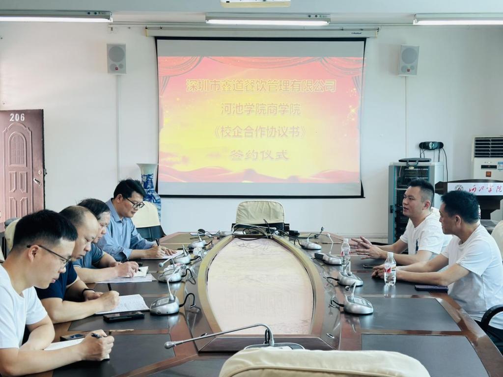 蓝振榕对深圳市鑫道餐饮有限公司一行表示热烈欢迎,覃举东向与会人员简要介绍了学院的办学特色、专业建设及人才培养情况。韦良成向与会人员详细介绍了公司的发展历程以及公司从事的餐饮品牌策划、国内贸易等业务情况,表达了深化校企合作的意愿。双方就项目潜在的合作模式、推进阶段以及内容细节进行了深入交流,达成了多项合作意向。